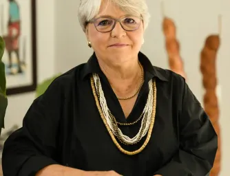 A black and white photo of a smiling woman with an afro